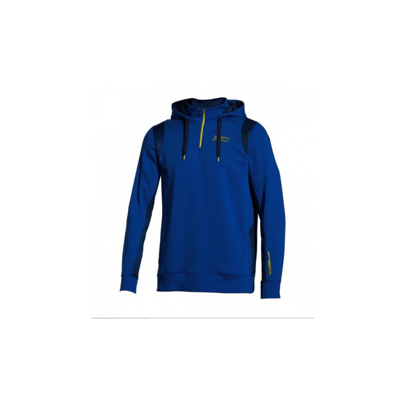 Poche kangourou devant, poche zippée, de couleur contrastée, sur le bras gauche
